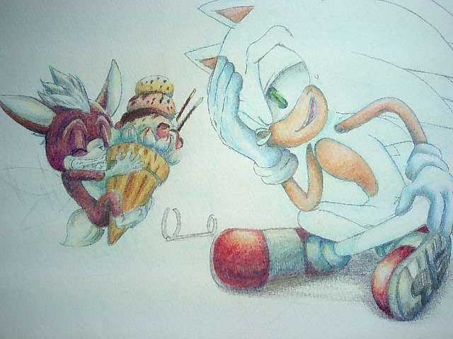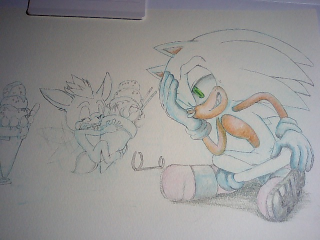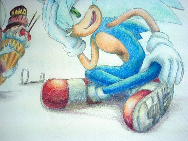 ソニックの表情を出すために、目のまわりの影は、慎重に描きました。