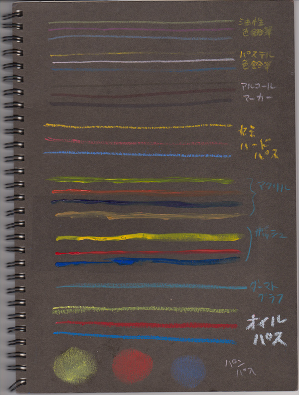 アナログ画材で、どれがいいのかわからない、というきっかけから、自宅にある画材をちょっと持ってきて、どの画材が合うのか試していました。