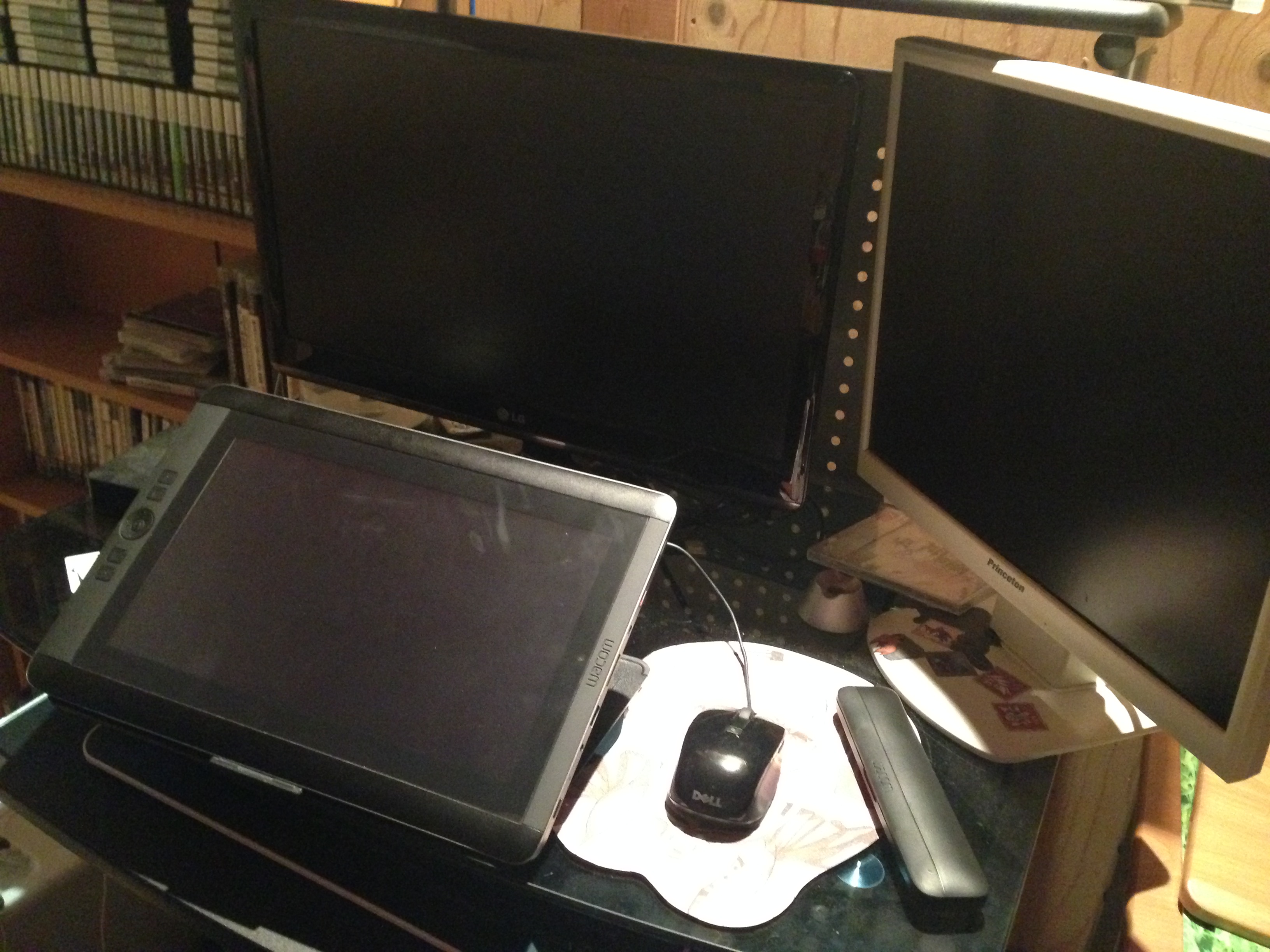 2画面のデュアルモニターにしていたんですが、うちのPCでは液タブまでつけて3画面を表示する能力がなく… メインと液タブ、か、メインとサブ、の2画面構成をしています。